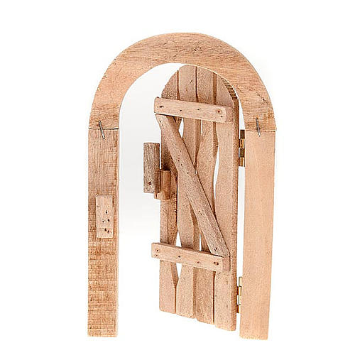 porte en bois avec chambranle en arc et gonds. Miniatures pour crèche, montage manuel. Accessoires réalisés à la main en Italie avec des matériaux non toxiques.