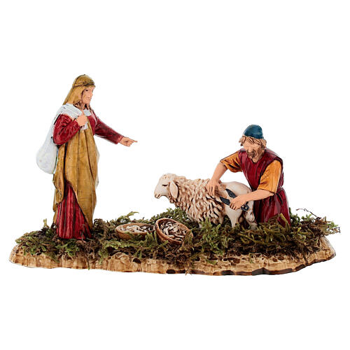 Scène tondeur 10 cm Moranduzzo. Scène avec 2 santons de crèche de la marque Moranduzzo, réalisée en pvc avec peinture sérigraphiée et finition à la main style 700.