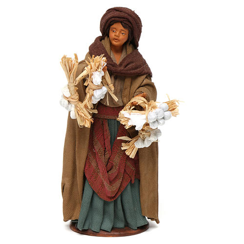 Femme tresses aïl en main 14 cm crèche Naples. Santon représentant une femme avec des tresses d'aïl pour crèche de Noël, réalisée de manière artisanale à Naples en terre cuite et habillés de véritable tissu. Chaque pièce est unique.