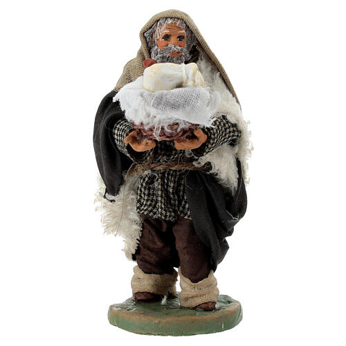 Homme panier charcuterie en main 10 cm crèche Naples. Composition de santons de crèche de 10 cm représentant un homme avec un panier de charcuterie à la main, réalisée avec figurines de crèche napolitaine en terre cuite produites de manière artisanale à Naples, en Italie. Chaque santon en terre cuite est d'abord modelé à la main et ensuite habillé avec du tissu découpé et traité. Le travail artisanal rend chaque scène et chaque santon différents et uniques.
