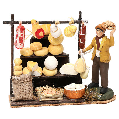 Scène berger avec fromages et charcuterie terre cuite peinte 8 cm. Santon de crèche napolitaine en terre cuite peinte avec décor en bois, représentant un berger avec un étal de fromages et charcuterie, produit à la main par des artisans napolitains expérimentés. Chaque pièce est différente et unique.