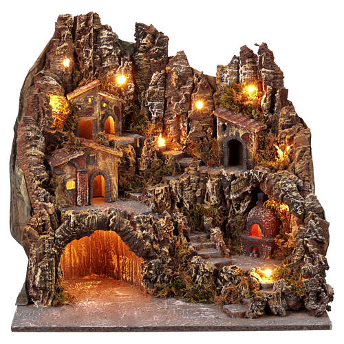 Village illuminé avec four pour crèche napolitaine, dimensions 51,5 x 41 x 50 cm.