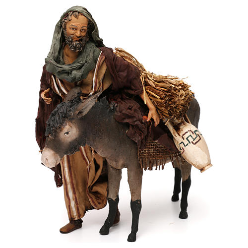 Berger avec âne 18 cm crèche Tripi. Santon de berger qui rentre à la maison après une journée de travail avec son pauvre âne tellement chargé qu'il décide de ne pas le fatiguer davantage et de marcher à ses côtés.La figurine est réalisée en terre cuite et tissu, minutieusement peinte à la main.Angela Tripi, artiste sicilienne de renommée internationale, arrive à réaliser des santons caractérisés par une extraordinaire richesse de détails, charisme et expressivité.Particularité très importante de son oeuvre : ses statuettes ont un corps entièrement formé, non pas comme les autres santons traditionnels en terre cuite où au squelette recouvert de tissu on vient rajouter tête, mains et pieds. Ses figurines ont des corps en terre cuite habillés de tissu.