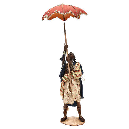 Esclave parasol 30 cm Tripi. Santon de crèche en terre cuite et tissu de l'artiste Angela Tripi, entièrement fabriqué à la main.Les visages et les expressions sont intenses et expriment en même temps harmonie, mouvement et tradition.Les figurines de l'artiste sicilienne sont tirées de l'ancien monde arabe dont elle s'inspire pour créer ses oeuvres uniques.Le travail artisanal rende chaque pièce unique et différente. L'article peut donc subir des légères variations par rapport à celui de la photo.