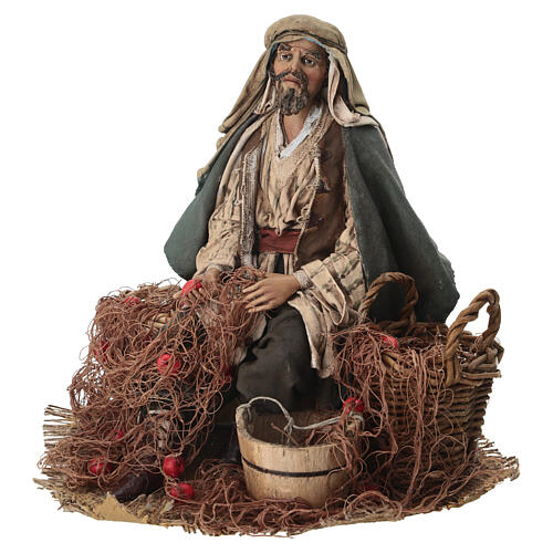 Pêcheur assis 30 cm crèche Angela Tripi terre cuite. Statuette en terre cuite réalisée par Angela Tripi et ses artisans, représentant un pêcheur assis en train de ranger son filet dans des paniers en osier afin de se préparer à sortir en mer.