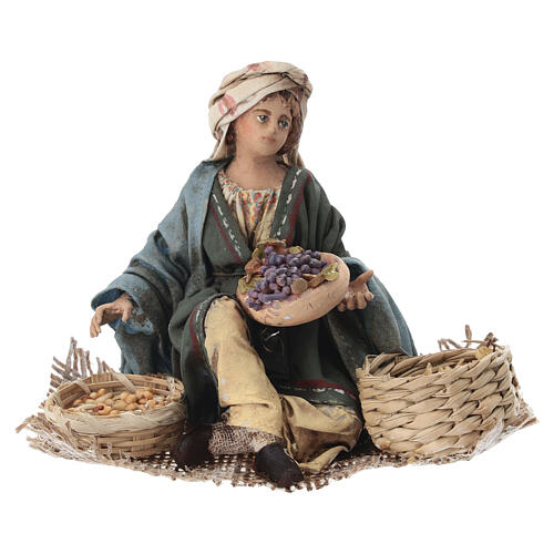Vendeuse de raisins et céréales 13cm Angela Tripi. Santon représentant une femme couchée avec paniers de raisins et céréales . Figurine réalisé en terre cuite par l'artiste sicilienne Angela Tripi, finement travaillée dans tous les détails et habillée avec vêtements en tissu. Indiquée pour crèche avec personnages de 13cm.