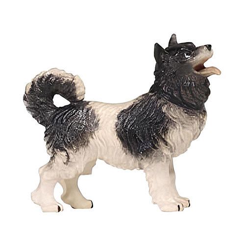 Chien bois peint crèche Rainell 9 cm Val Gardena. Santon d'animal pour crèche en bois peint du Val Gardena, modèle Rainell de 9 cm, réalisé à la main par des artisans locaux.