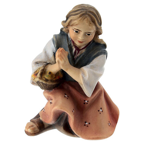 Petite fille qui prie agenouillée pour crèche Original Berger bois peint Val Gardena de 12 cm. Figurine d'enfant pour crèche de 12 cm, modèle "Original Berger" en bois d'érable du Val Gardena peint avec couleurs à l'huile. Santon de petite fille à genoux, les mains jointes, tenant un panier de fruits sous le bras.