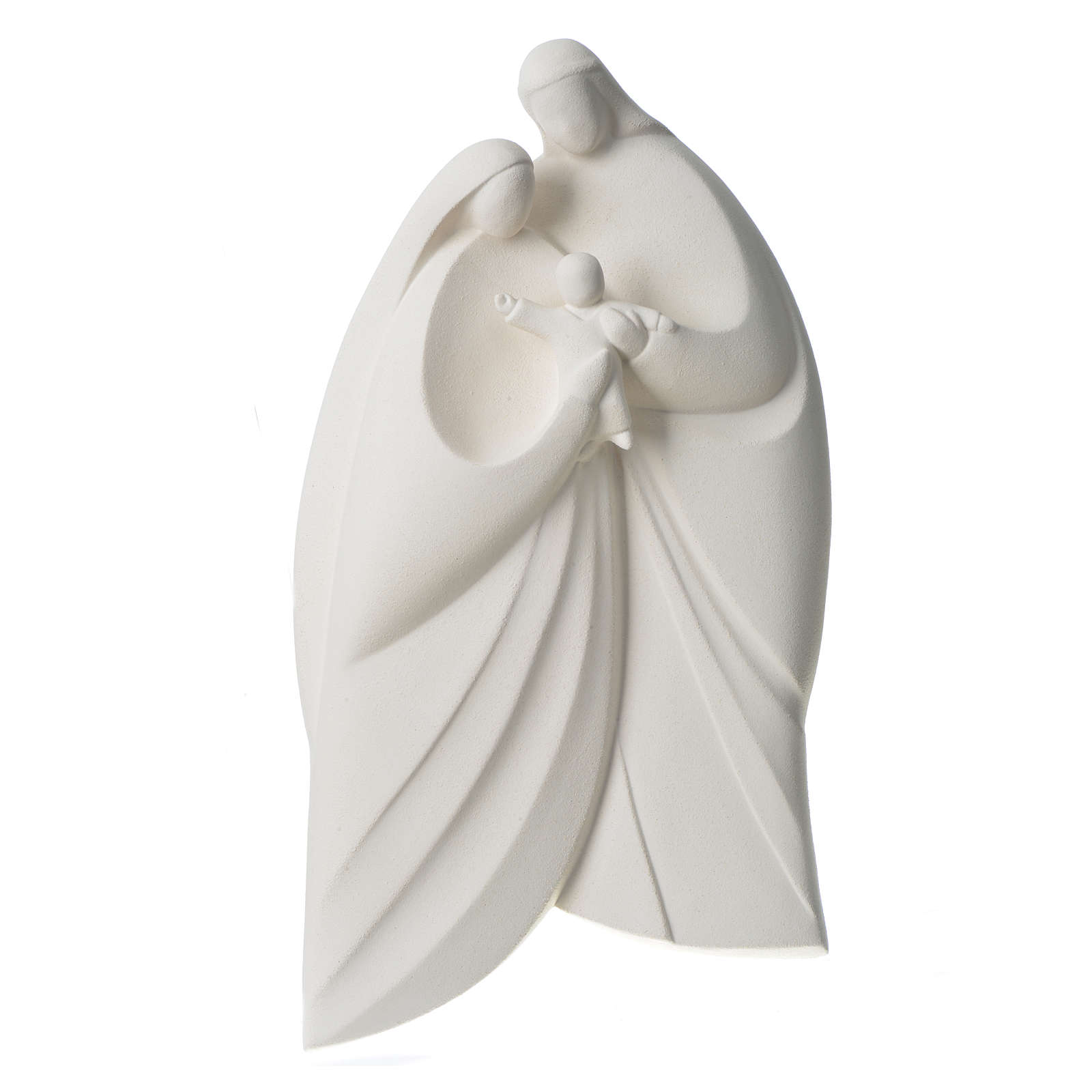 Sainte famille en argile blanche modèle Lis. Sainte Famille stylisée réalisée à la main en Italie en argile réfractaire blanche. L'argile est travaillée et moulée à la main et après cuite à plus de 1000°C. Le travail artisanal et le soin pour les détails donnent au produit des lignes essentielles et expressives au même temps. Produit d'haute qualité complètement réalisé en Italie dans l'Atelier céramique du Centre Ave de Loppiano (Florence)