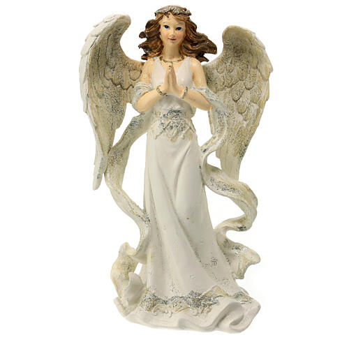 Statue ange mains jointes 23 cm. Statuette d'ange aux mains jointes, avec ailes pailletées, réalisée en résine.Dimensions : 22x14x8 cm.