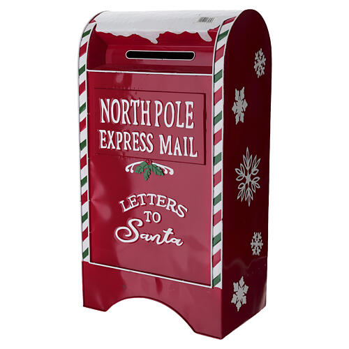 Boîte aux lettres de Noël conçue pour recueillir les lettres des enfants adressées au Père Noël pendant les fêtes, réalisée en métal, de couleur rouge, avec un bord supérieur orné d’un effet neige rappelant l’atmosphère du Pôle Nord.