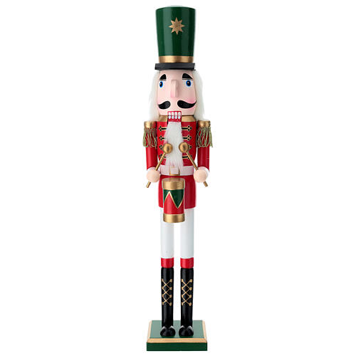 Statuette en bois d'un casse-noisette classique de Noël, habillé dans le tons rouge et blanc, avec détails verts, dorés et noirs. Le personnage est représenté en train de jouer du tambourin, donnant mouvement et caractère à la scène. Figurine réalisée en bois certifié FSC Mix 100%, provenant de forêts gérées de manière responsable selon de rigoureux standards environnementaux, sociaux et économiques.