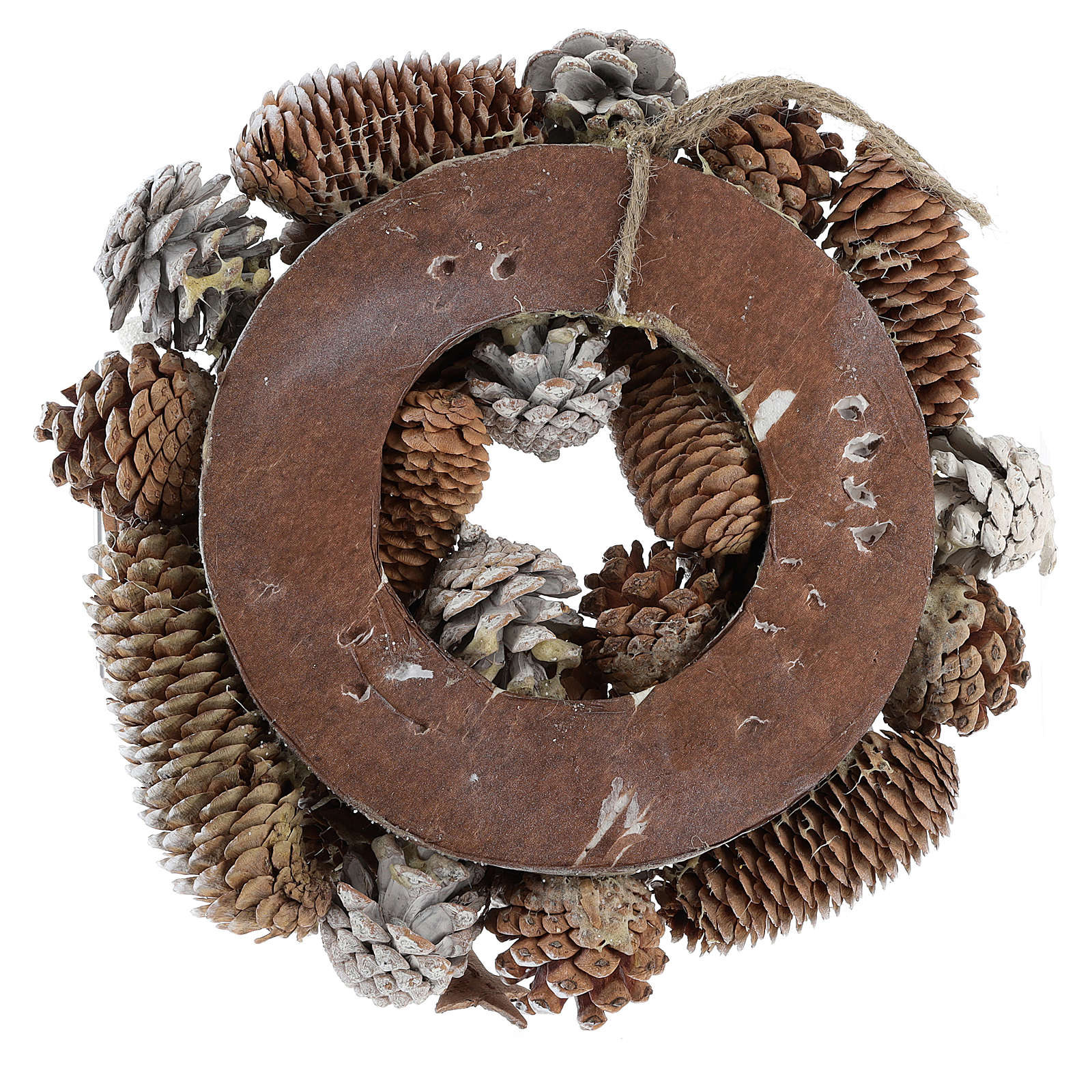 Couronne Noël pommes de pin blanches et glitter. Couronne de Noël de pommes de pin de type différent peintes en blanc avec glitter argentés et corde pour la suspendre.