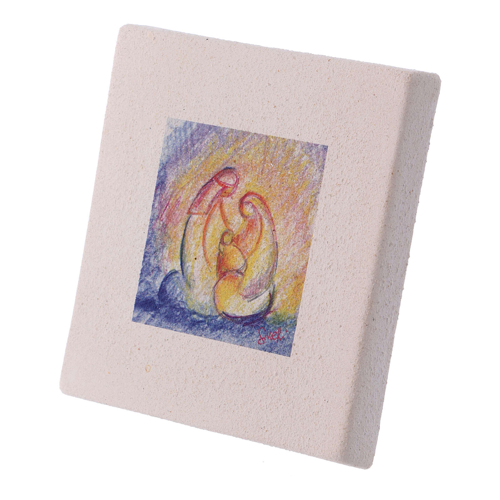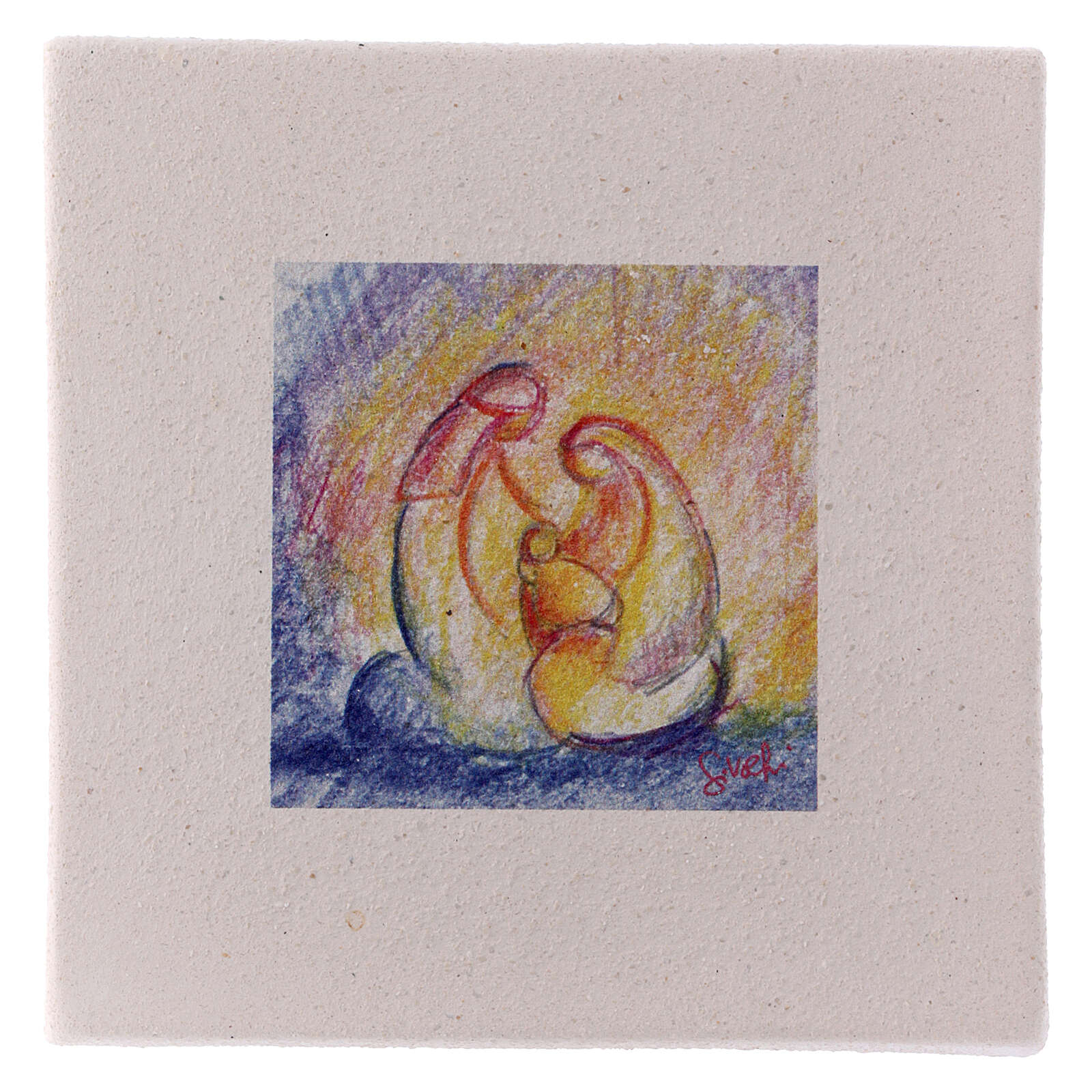 Cette Sainte Famille est stylisée, colorée à la main avec les couleurs froides aux extrémités et les couleurs chaudes au milieu afin de communiquer la chaleur et l'union de la Famille.
