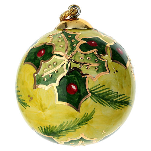Boule de Noël Dellarte Ceramiche en céramique artistique, représentant un élégant mélange de feuilles de houx vert vif et de baies rouges brillantes sur un fond vert clair. Chaque détail est peint à la main et rehaussé de finitions en or pur qui apportent luminosité et prestige à l'ensemble.