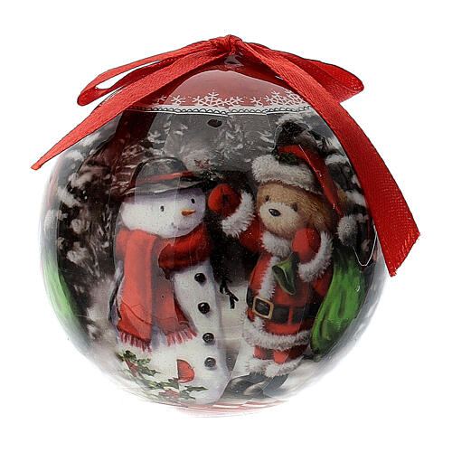 Boule ourson sapin de Noël 75 mm divers modèles. Boules pour sapin de Noël en pvc avec images d'oursons dans une boîte assortie. Un ruban rouge permet de suspendre les boules d'un diamètre de 75 chacune.