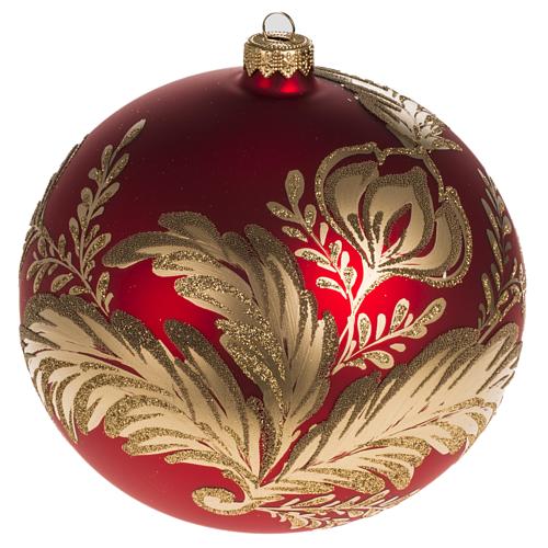 Décoration sapin de Noel rouge en verre soufflé de 15 cm de diamètre. Boule de Noel peinte à la main avec décorations florales dorées.