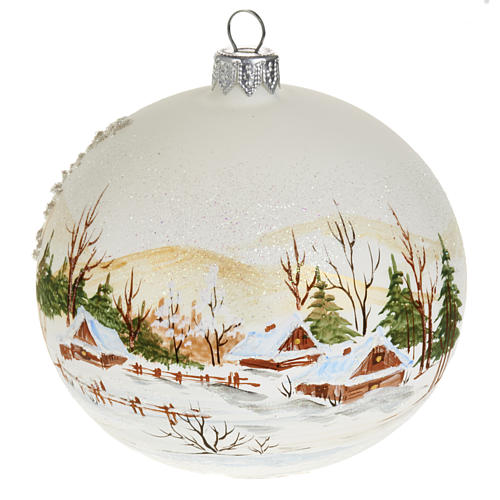 Ornement sapin, boule de Noel en verre soufflé de 10 cm de diamètre, peinte à la main avec un paysage enneigé.