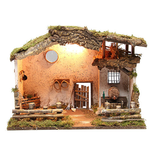 Cabane rurale illuminée crèche 36x50x26 cm avec taverne et fontaine. Cabane dans décor rural pour crèche, adaptée à des santons de 10-12-14-16 cm, entièrement produite en Italie avec des matériaux de qualité. Décor doté de deux prises électriques: pour illuminer le décor et pour actionner la fontaine une fois la petite bassine remplie d'eau.