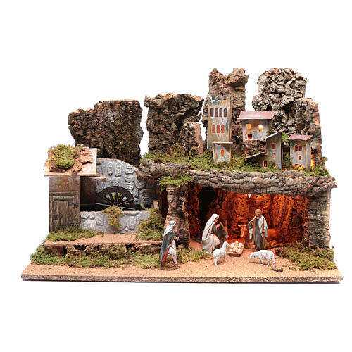 Paysage rocheux avec moulin animé et éclairage 40x60x40 cm. Paysage rocheux pour crèche composé de grotte illuminée avec éclairage led, maisons et rochers. Un moulin à eau animé complète le décor.