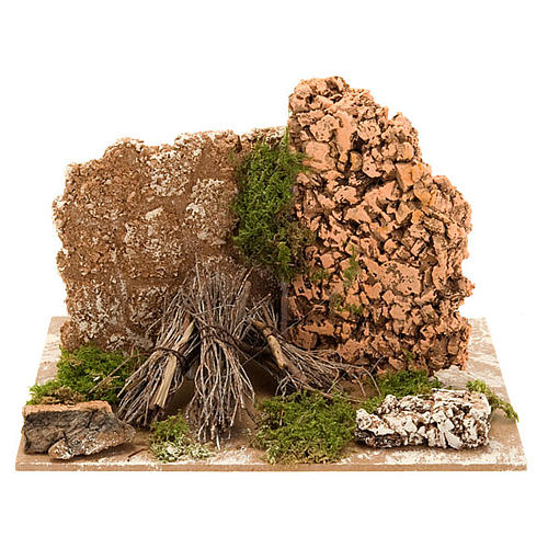 Feu pour crèche avec rameaux et mur en liège. Le feu est produit grâce à une boule avec lumière tremblante connectée au courant électrique 220v. Milieu avec mur en liège similaire au rocher, des rameaux et de la mousse. Milieu pour crèche réalisé en Italie de manière artisanale.