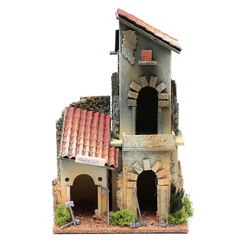 Décor avec atelier forgeron 28,5x18x15 cm. Décor avec arcades pour santons de 3-4 cm, toit en tuiles et atelier de forgeron au rez-de-chaussée avec écriteau.