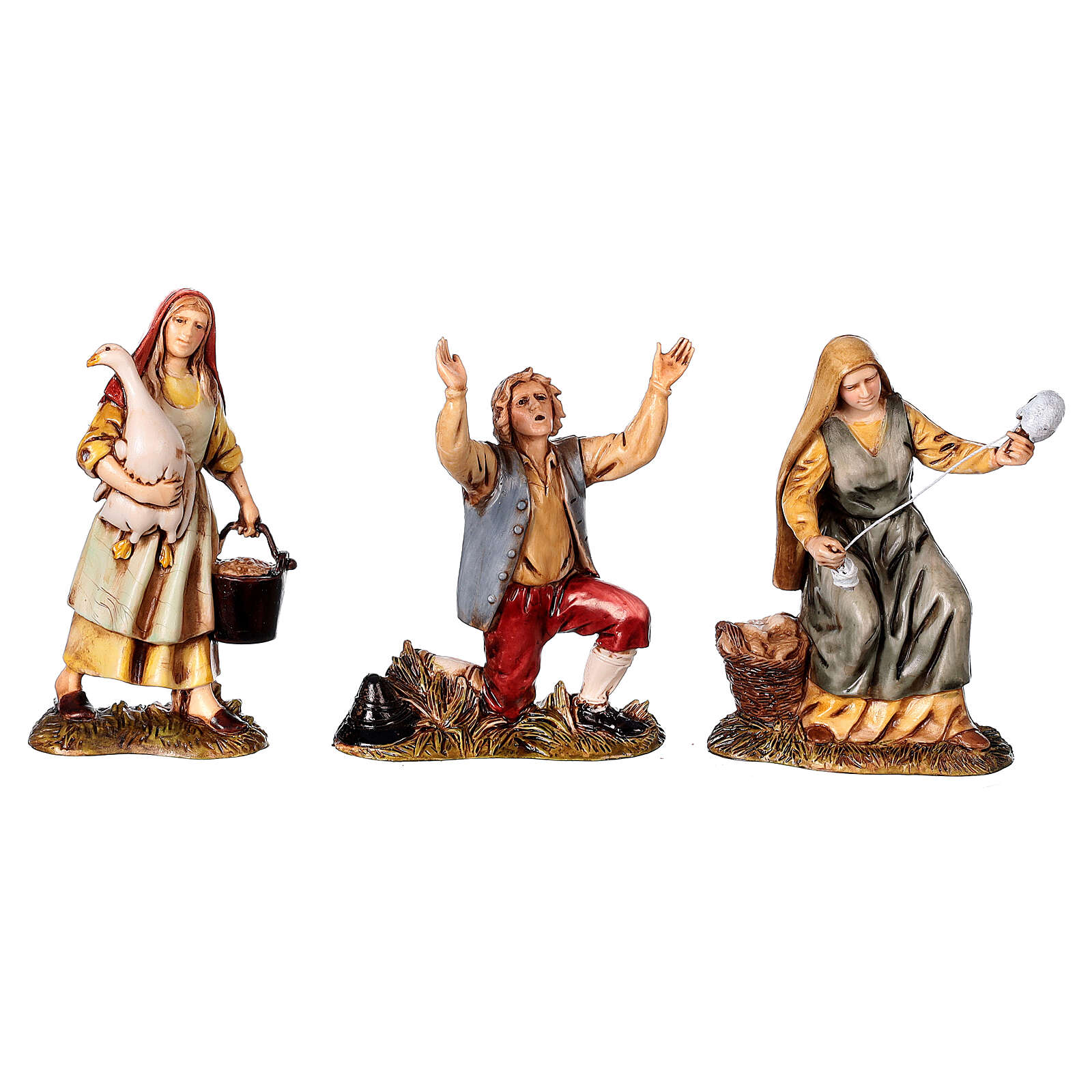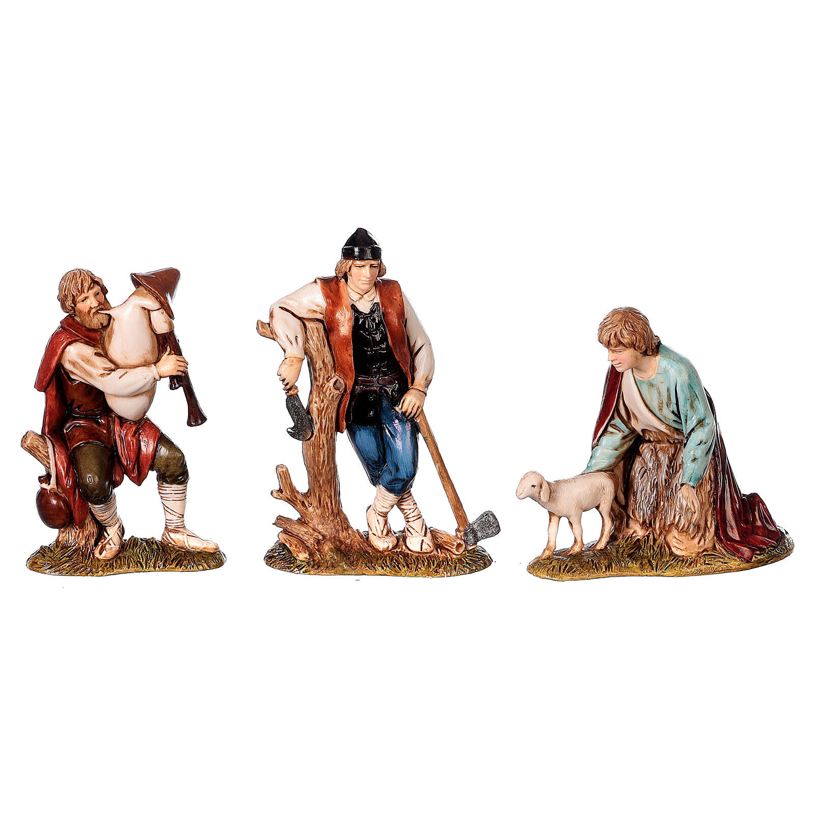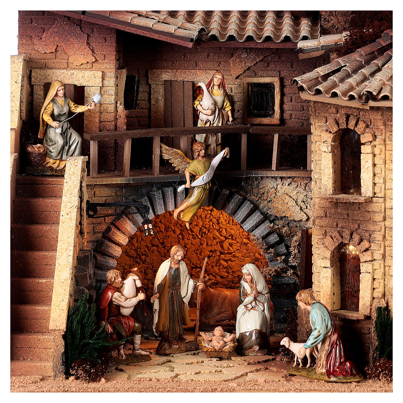 Décor de crèche avec 14 santons Moranduzzo de 10 cm de hauteur moyenne, représentant la Nativité avec un ange et 8 bergers (possibilité de les acheter séparément avec les codes PR005346, PR019458, PR019459 et PR019501).