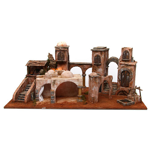 Village style arabe 80x40x50 cm. Décor en style arabe pour crèche avec éclairage et fontaine, adapté pour santons de 10 cm. Décor de production artisanale italienne.