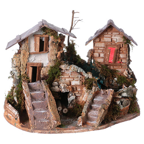 Cascade dans les maisons, milieu crèche de noël. Bourg avec cascade réalisé en Italie en utilisant des matériaux naturels. Dimensions: 30x28x28
