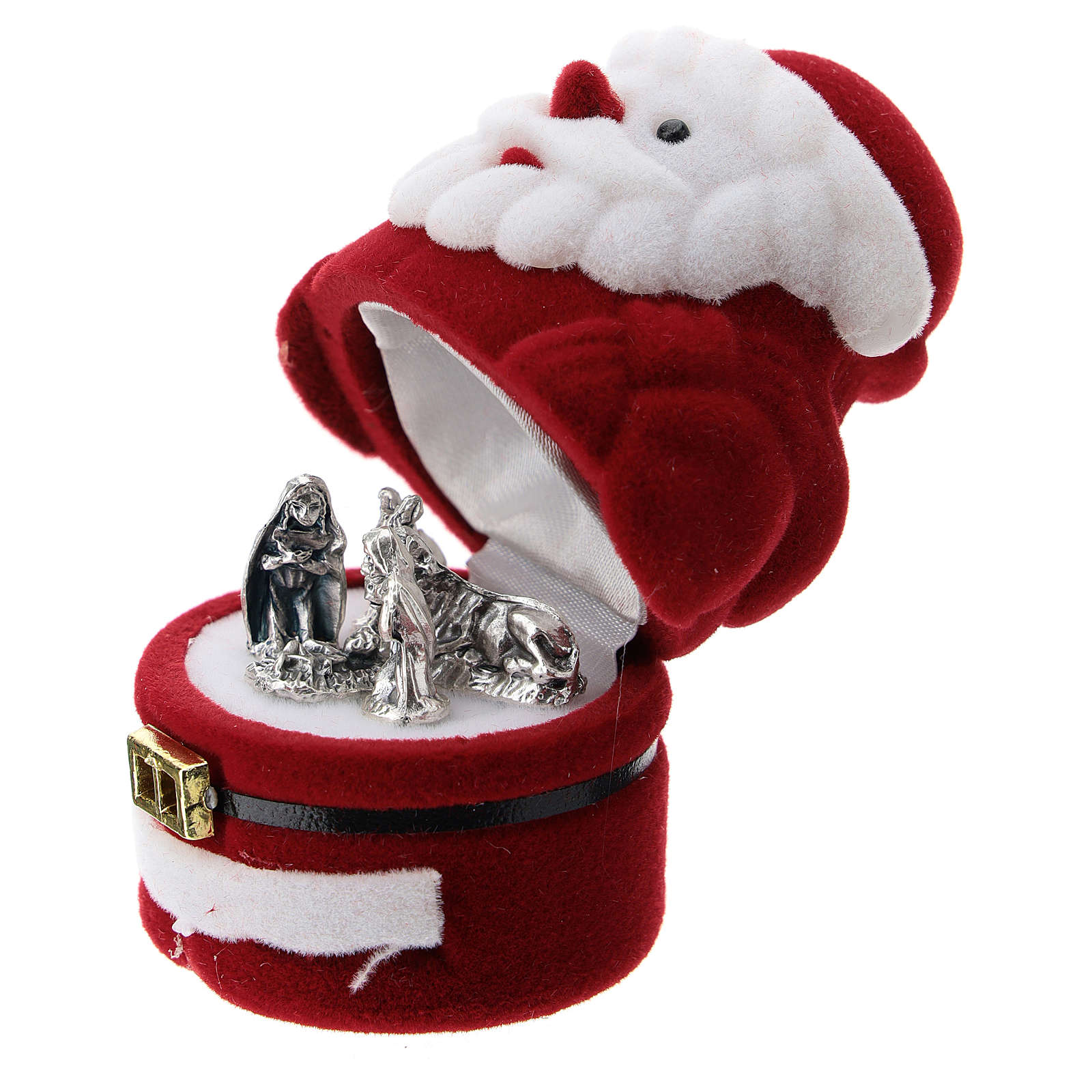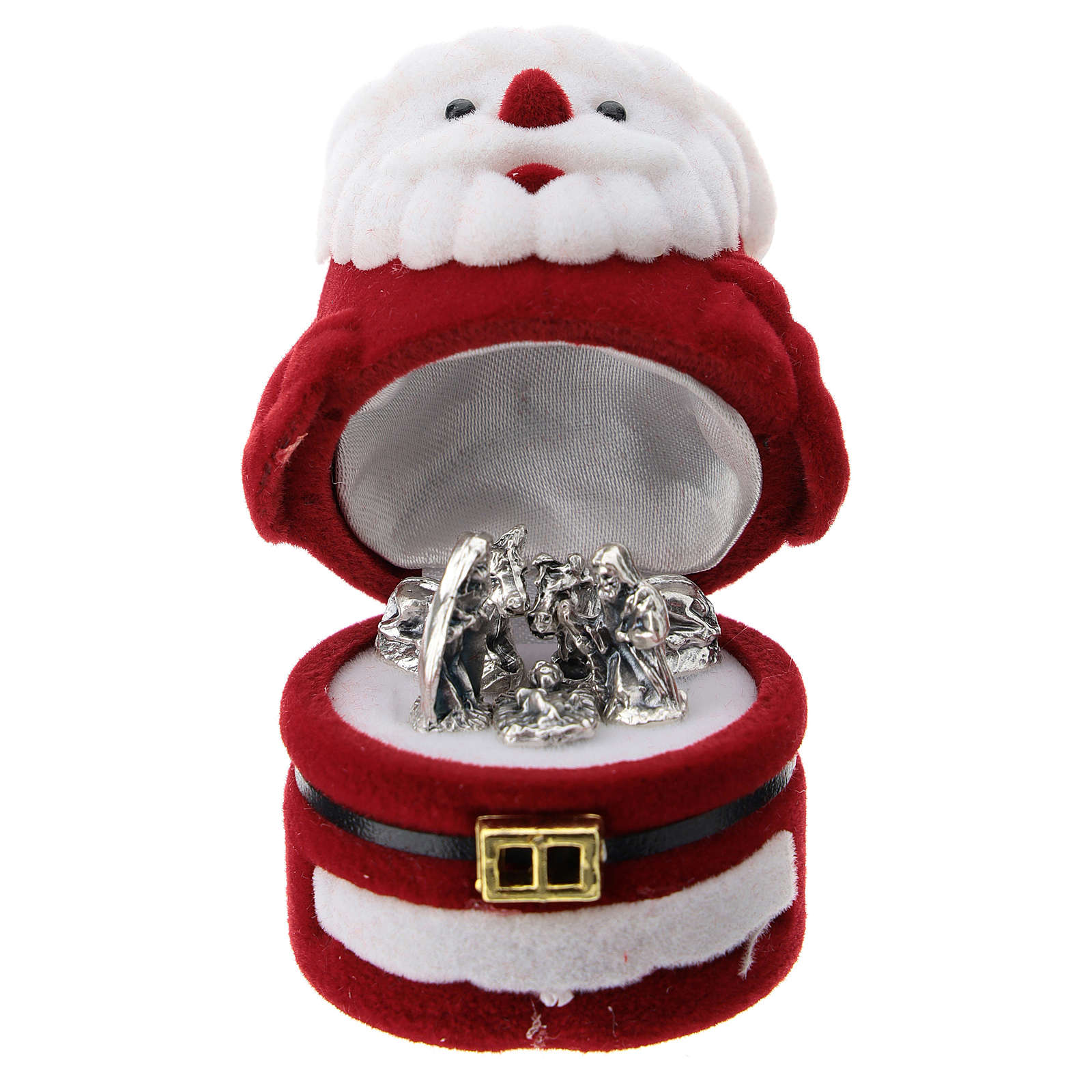 Coffret Père Noël avec nativité velours rouge. Petit coffret en forme de Père Noël en velours rouge avec nativité en miniature à l'intérieur.