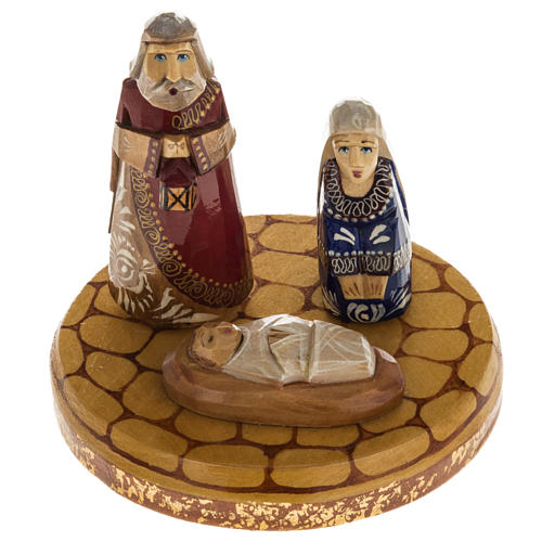 Crèche russe en bois de sapin avec base ronde. Crèche décorée qui reproduise la Sainte Famille classique sur base rende, complètement réalisée à Moscou en Russie par des artisans locaux.