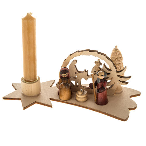 Mini crèche de Noel russe en bois de sapin avec bougie. Crèche avec figurines stylisées et fond gravé sur étoile filante, complètement réalisée à Moscou en Russie par des artisans locaux.