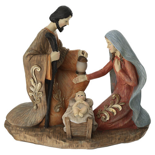 Groupe fixe en résine colorée avec finition effet bois, représentant la Nativité en un seul bloc compact.