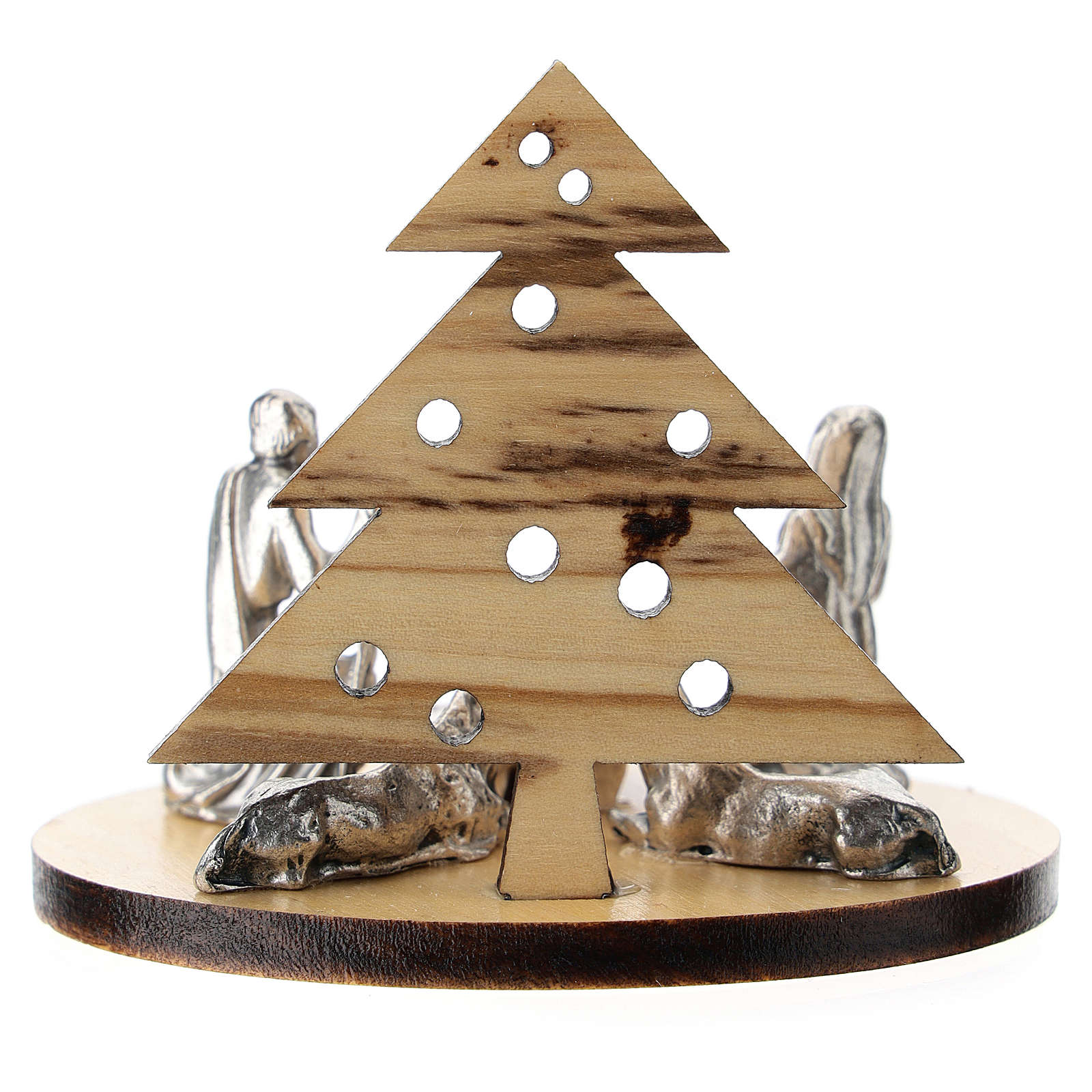 Nativité métal avec sapin en bois d'olivier 5 cm. Composition avec sapin de Noël stylisé en bois d'olivier et santons en métal.