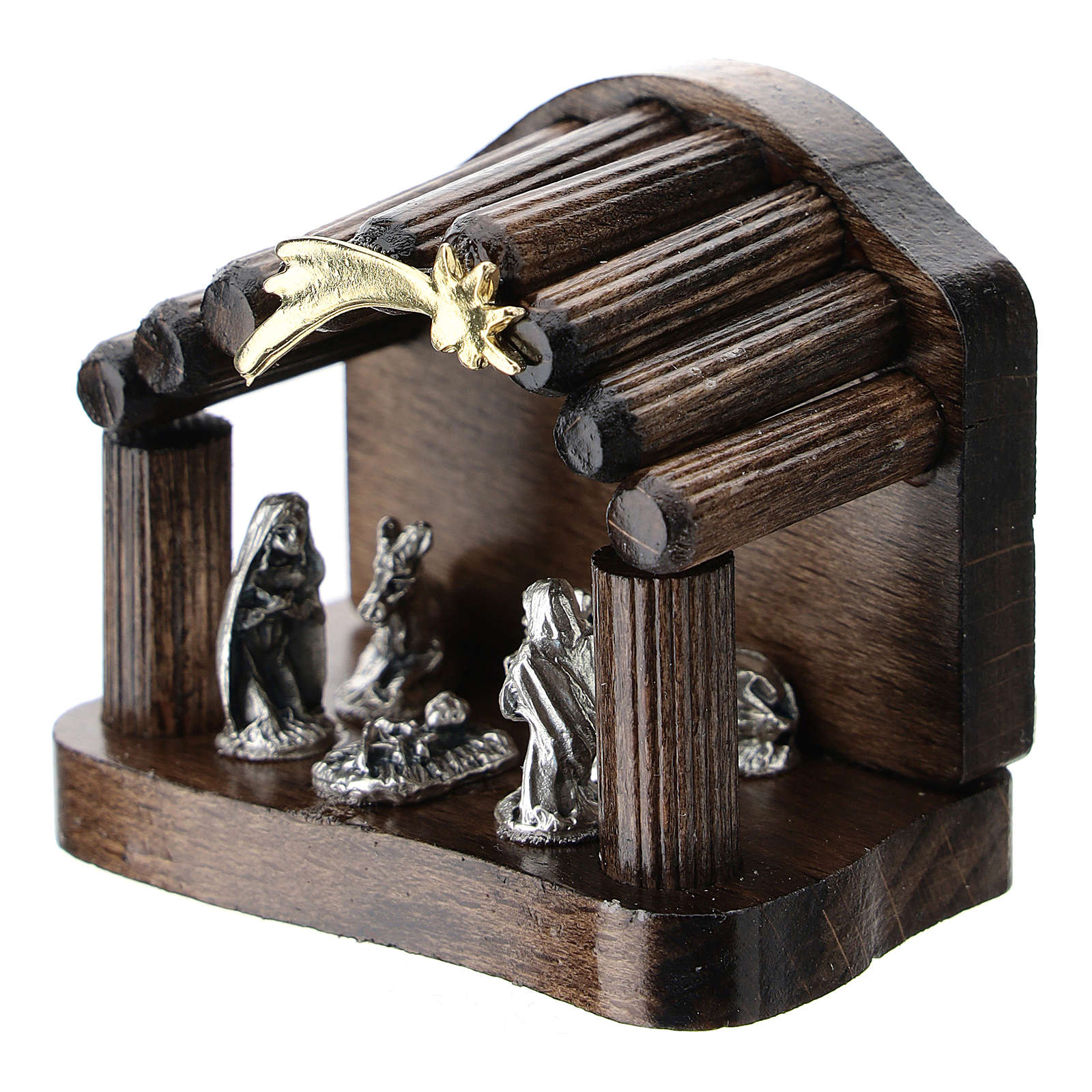 Nativité métal et cabane bois en rondins 5 cm. Cabane en bois effet rondins de 5 cm de hauteur avec nativité en métal.