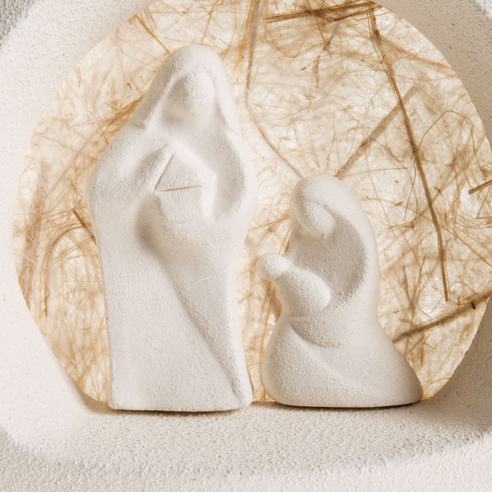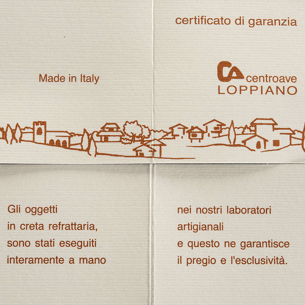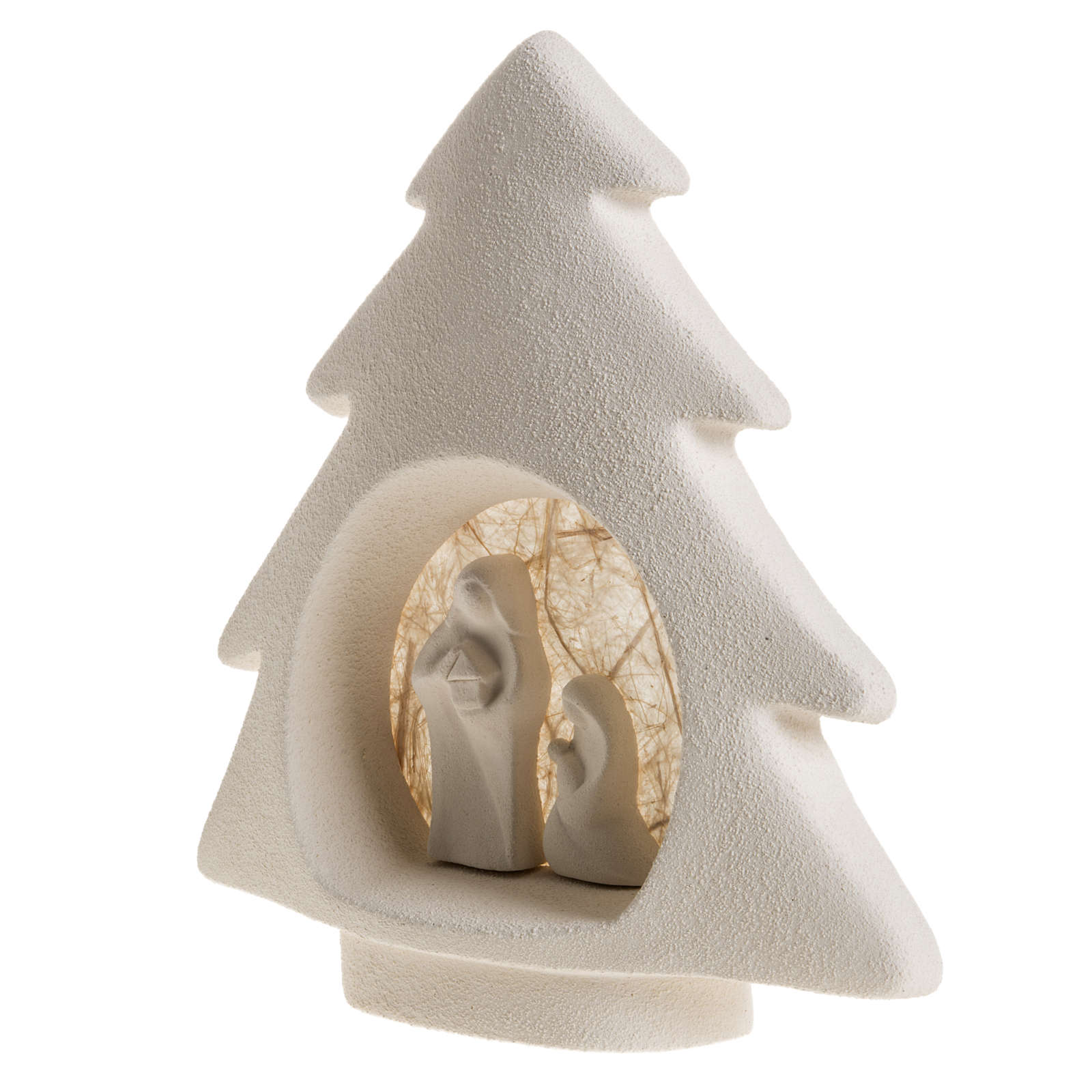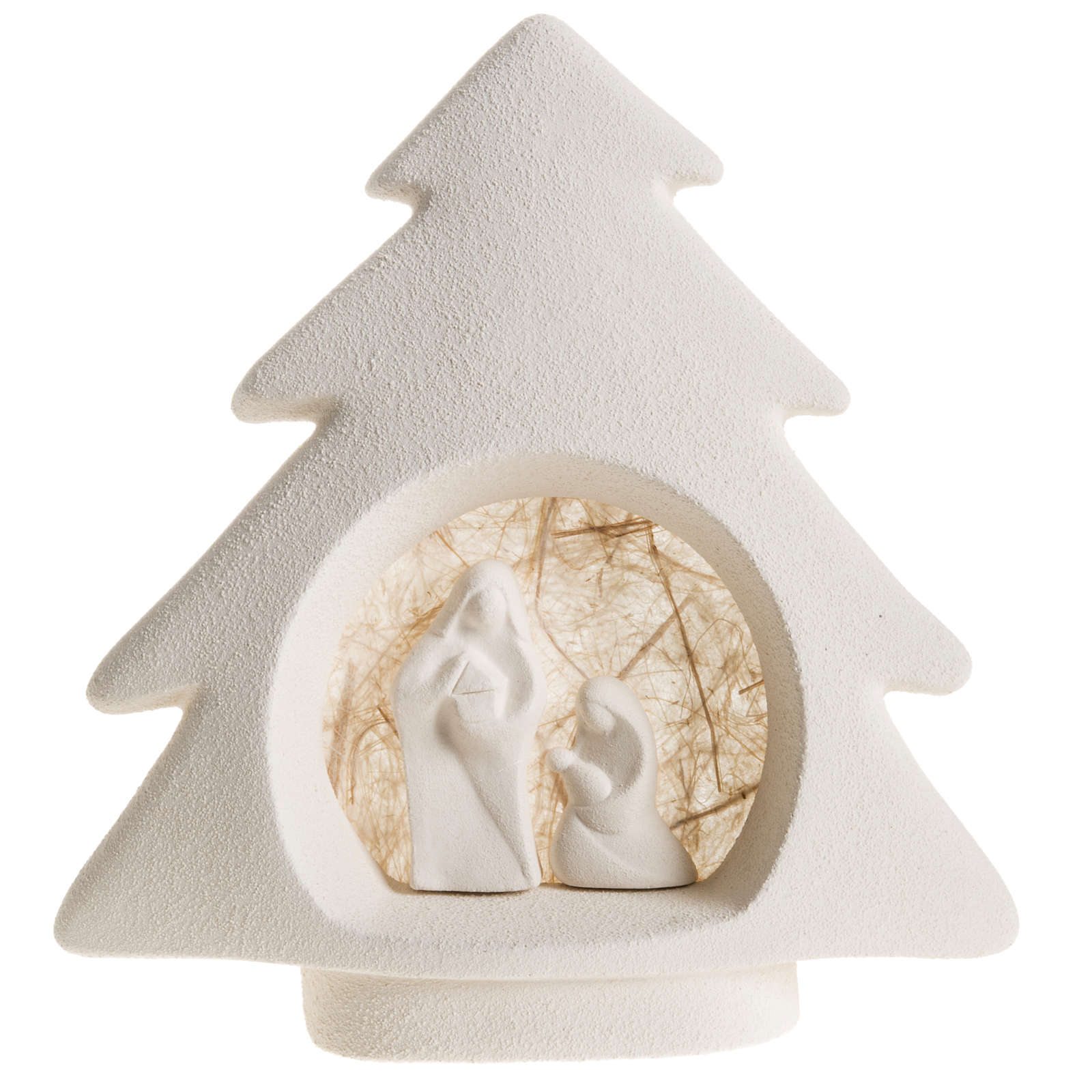 Sapin Noel à accrocher Nativité écru argile. Sapin de Noel avec Nativité stylisée réalisé à la main en Italie en argile réfractaire blanche et écru. L'argile est travaillée et moulée à la main et après cuite à plus de 1000°C. Le travail artisanal et le soin pour les détails donnent au produit des lignes essentielles et expressives au même temps. Produit d'haute qualité complètement réalisé en Italie dans l'Atelier céramique du Centre Ave de Loppiano (Florence)