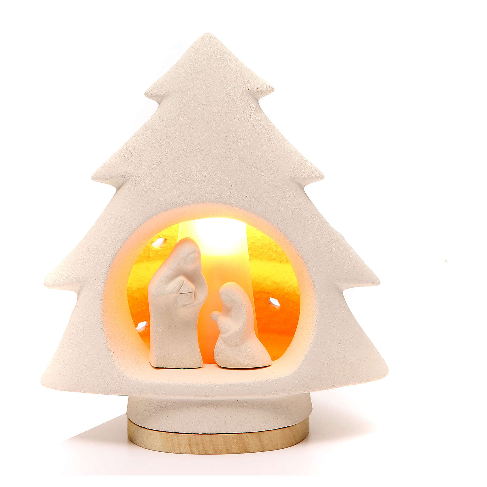 Sapin Noel Nativité modèle avec lumière argile. Sapin de Noel avec Nativité stylisée réalisé à la main en Italie en argile réfractaire blanche et illuminé par une ampoule. L'argile est travaillée et moulée à la main et après cuite à plus de 1000°C. Le travail artisanal et le soin pour les détails donnent au produit des lignes essentielles et expressives au même temps. Produit d'haute qualité complètement réalisé en Italie dans l'Atelier céramique du Centre Ave de Loppiano (Florence)