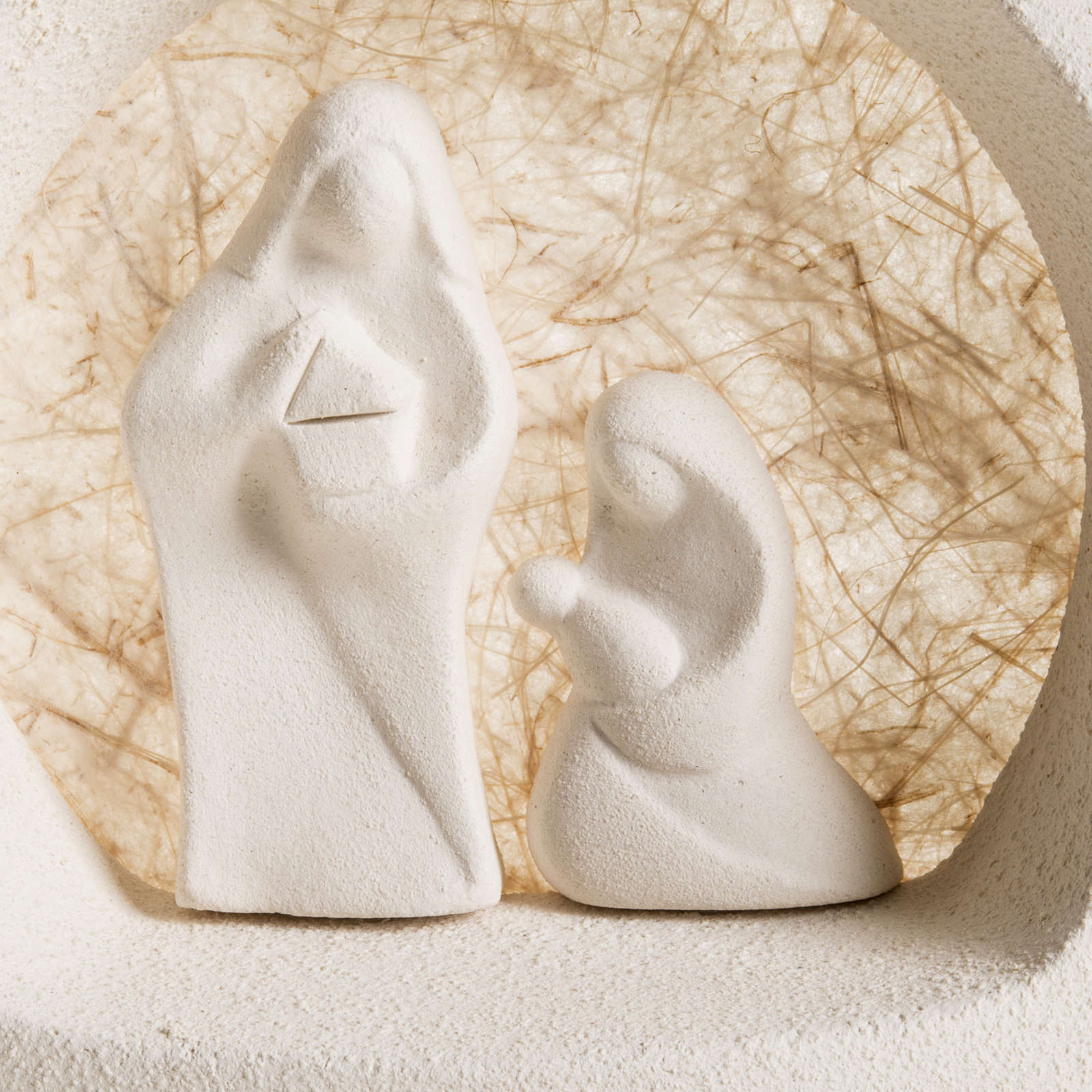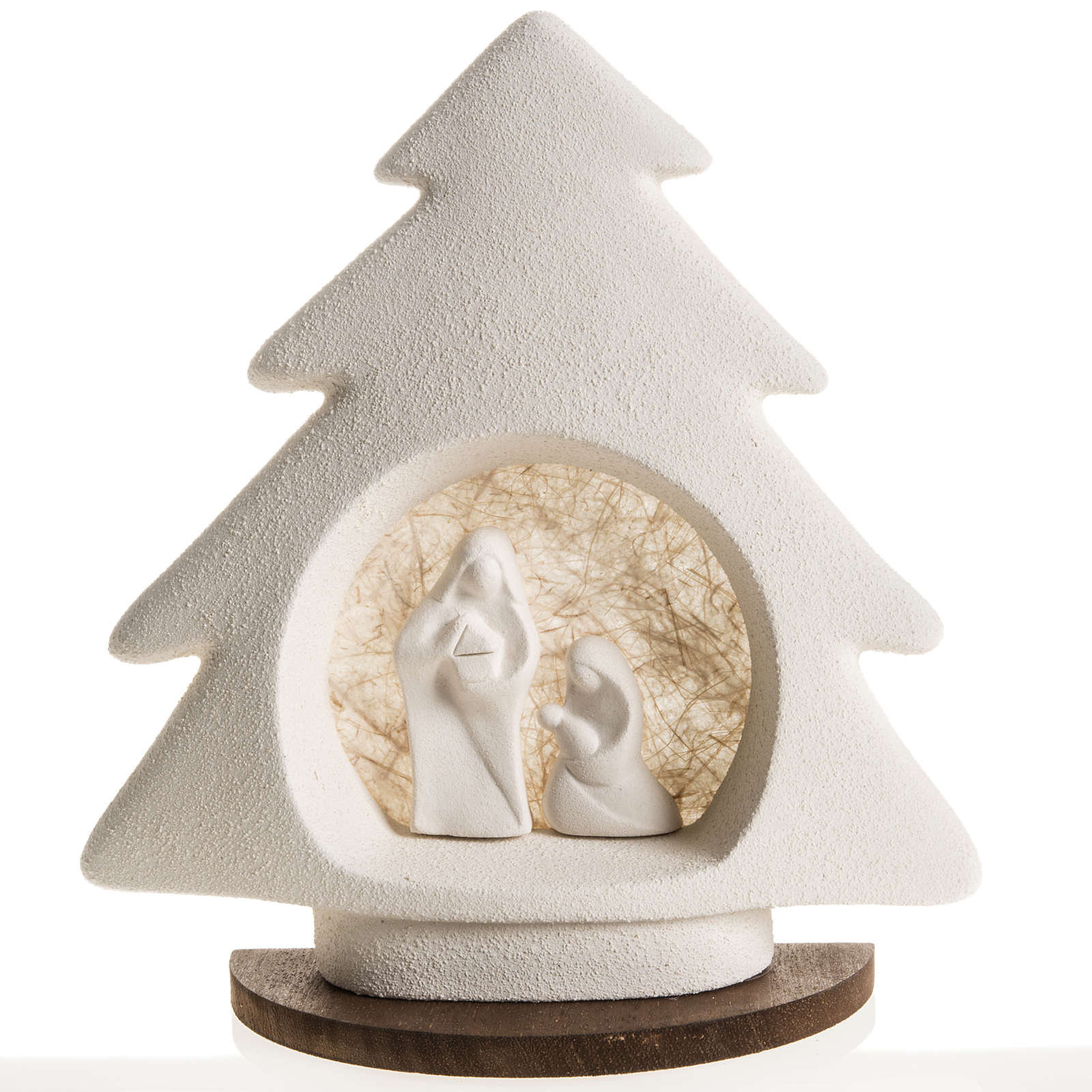 Sapin Noel sur base Nativité écru argile. Sapin de Noel avec Nativité stylisée réalisé à la main en Italie en argile réfractaire blanche et écru. L'argile est travaillée et moulée à la main et après cuite à plus de 1000°C. Le travail artisanal et le soin pour les détails donnent au produit des lignes essentielles et expressives au même temps. Produit d'haute qualité complètement réalisé en Italie dans l'Atelier céramique du Centre Ave de Loppiano (Florence)