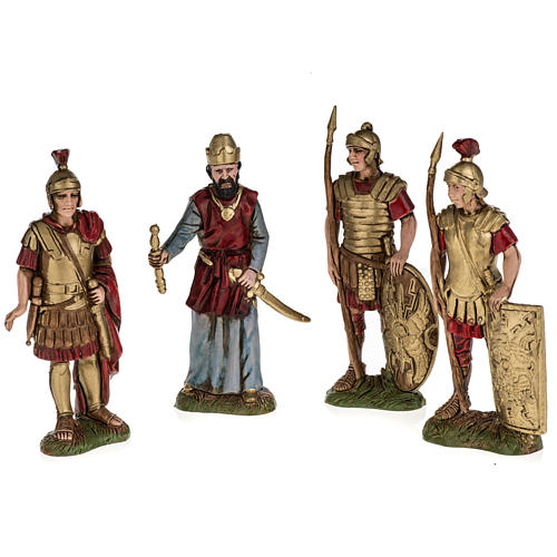 Roi Hérode et 3 soldats romains de la crèche Moranduzzo de 10 cm en plastique peints à la main. Santons de crèche complètement réalisés en Italie.