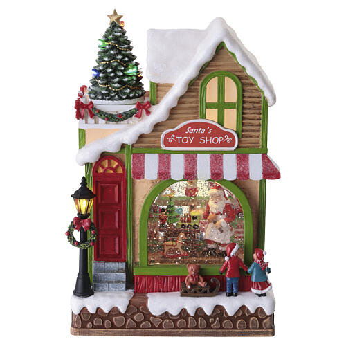 Décor magasin de jouets de Noël animé avec Père Noël et LED 30x15x20 cm