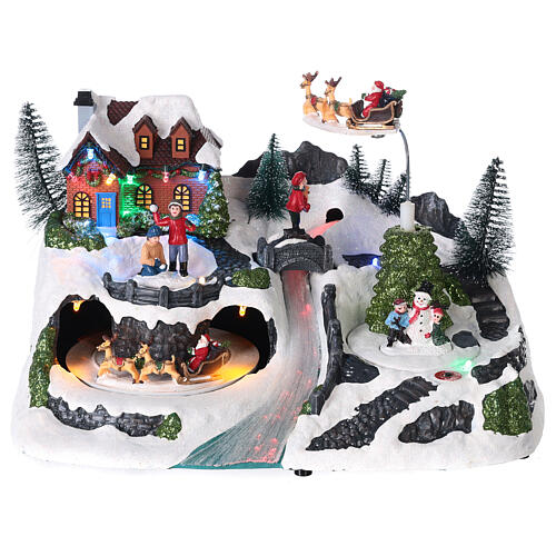 Scène Noël neige traîneau Père Noël animé lumières LED 20,5x30x17,5 cm. Scène de Noël représentant un village enneigé éclairé de lumières LED multicolores, une rivière éclairée, une maison, des sapins, des figurines, un bonhomme de neige et deux traîneaux de Père Noël en mouvement.
