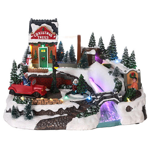 Village Noël neige voiture sapin mouvement lumières LED 21,5x32x23 cm. Village enneigé avec ruisseau gelé éclairé, revendeur de sapins, sapins enneigés, dont un animé, figurines, bonhomme de neige et voiture en mouvement.