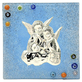 Petit tableau d'anges en verre de Murano pour baptême bleu ciel
