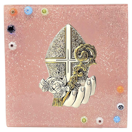 Tableau rose pour Confirmation en verre de Murano avec crosse épiscopale et mitre.