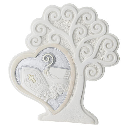 Cadeau d'invités pour la Confirmation en résine représentant un Arbre de la Vie stylisé avec un cœur central orné du symbole du Saint-Esprit en relief. La composition présente une structure ajourée, une application frontale moulée et des détails à finition lumineuse, avec support arrière intégré pour la pose sur surfaces planes.