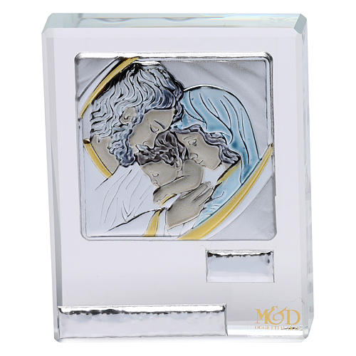 Bonbonnière Sainte Famille cadre plaque argent 5,8x4,6 cm. Cadre enrichi d'une plaque d'argent représentant la Sainte Famille, idéal comme cadeau pour une occasion spéciale (mariage, baptême..). Bonbonnière entièrement réalisée à la main en Italie.