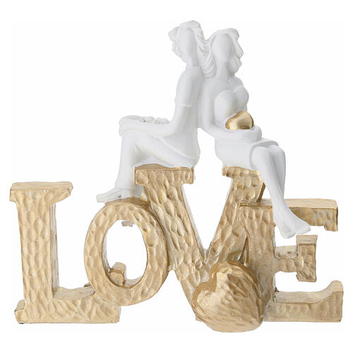 Souvenir représentant un couple assis sur l'inscription « love » avec finition or et blanc.