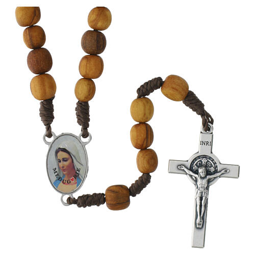 Chapelet en bois d'olivier de Medjugorje sur corde avec croix en métal et la Vierge de Medjugorje sur la pièce centrale. Réalisé par les artisans de Medjugorje.