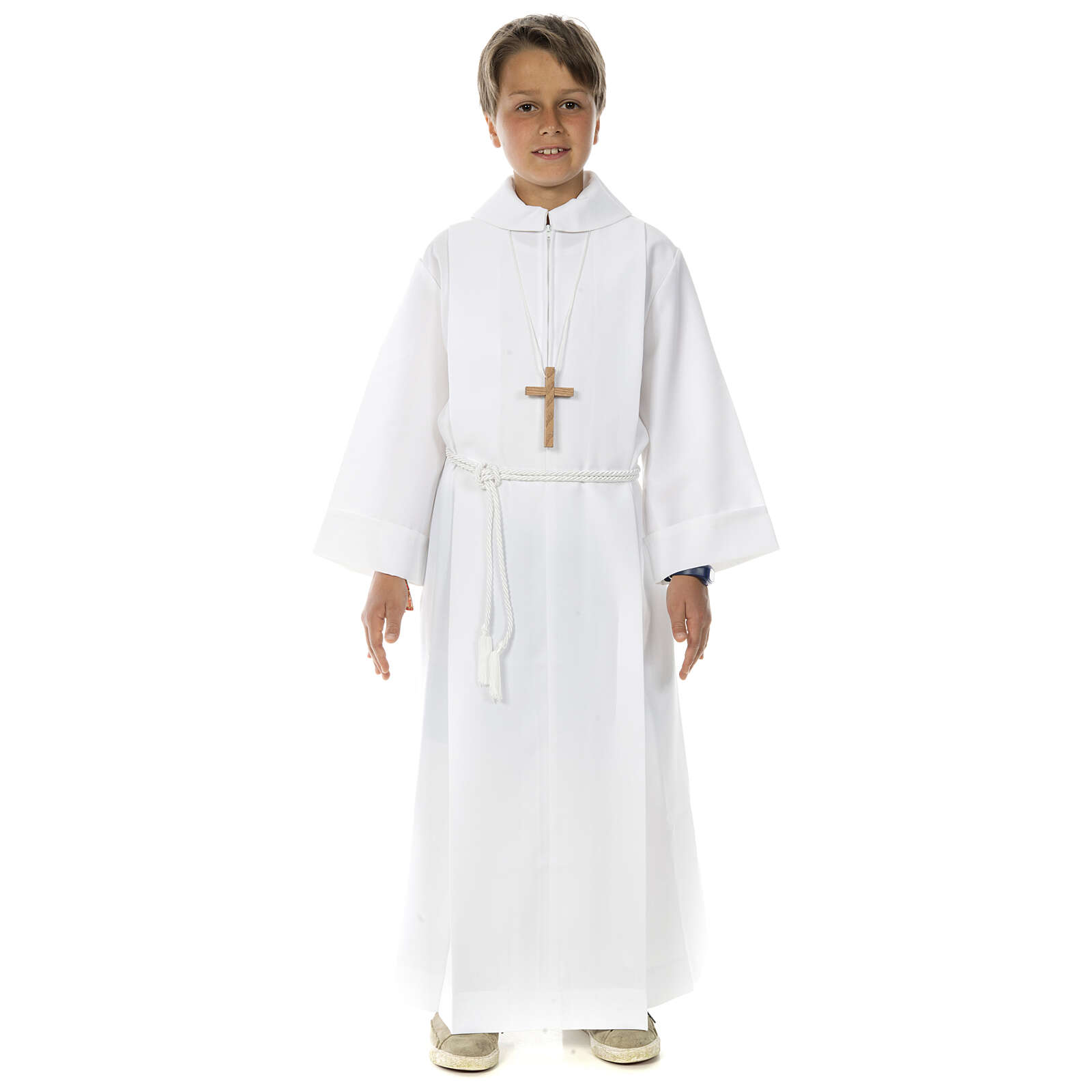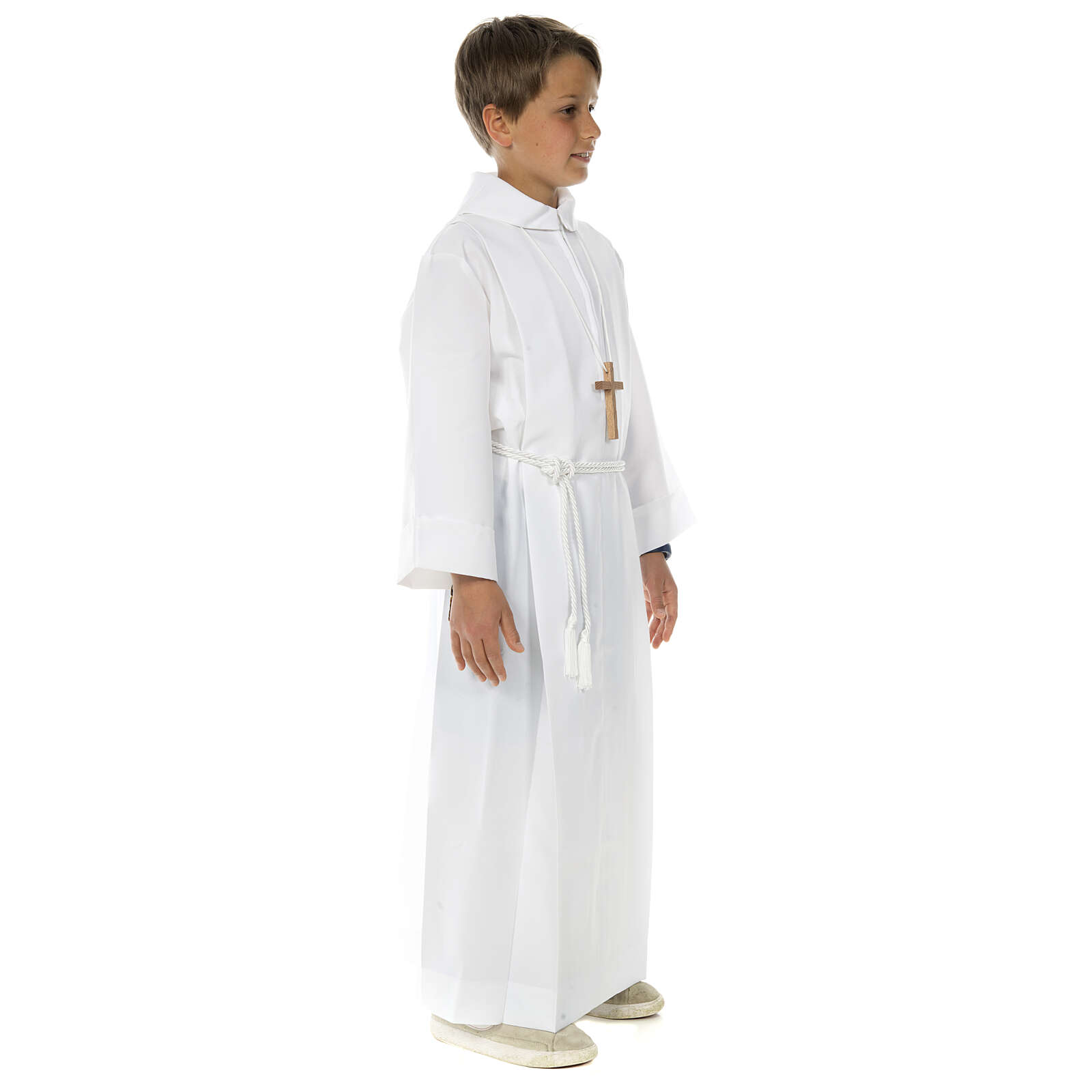 Cette robe pour la première communion est réalisée en Italie avec matériaux exclusivement d'origine italienne. Aube première communion blanche, simple avec deux plise et faux capuchon, réalisée en polyester.