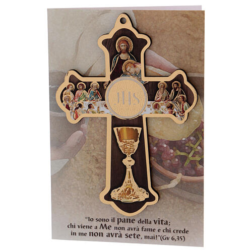 Croix Communion impression sur bois avec carton Calice et Cène.